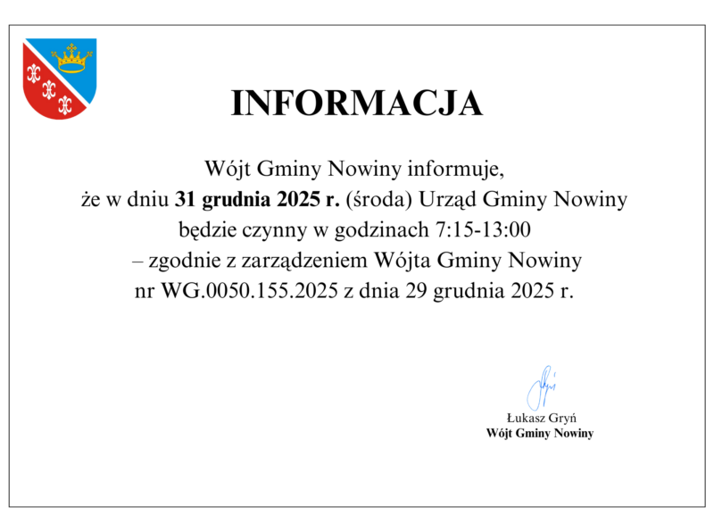 Zarządzenie nr WG.0050.153.2025  Wójta Gminy Nowiny z dnia 23 grudnia 2025r. – pdf do pobrania