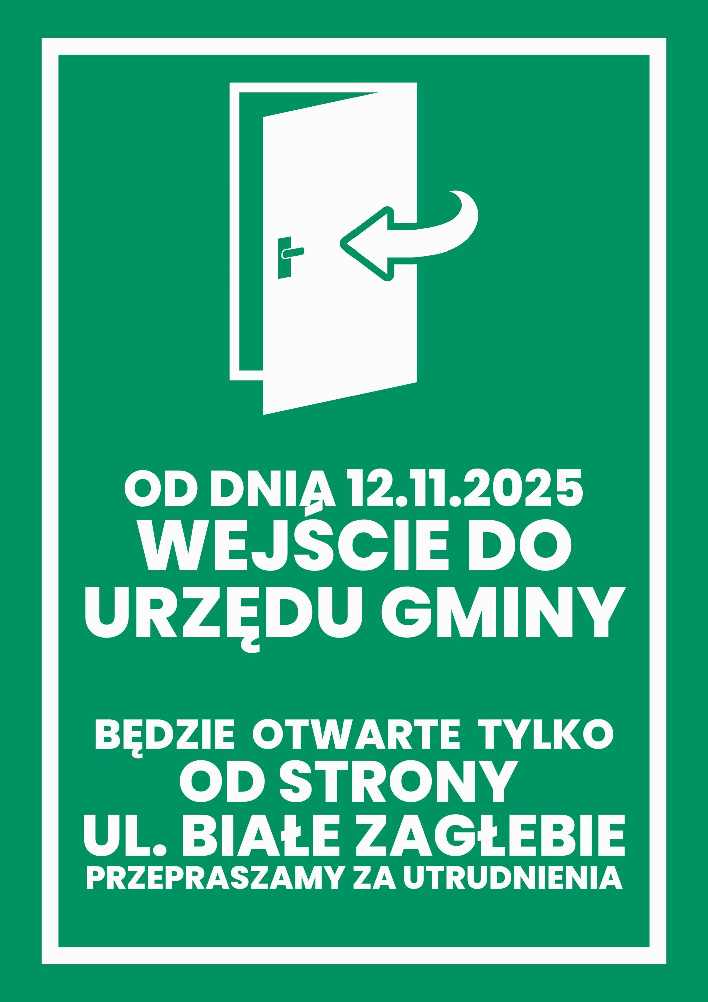 INFORMACJA – OD DNIA 12.11.2025 WEJŚCIE DO URZĘDU GMINY BĘDZIE OTWARTE TYLKO OD STRONY UL. BIAŁE ZAGŁEBIE