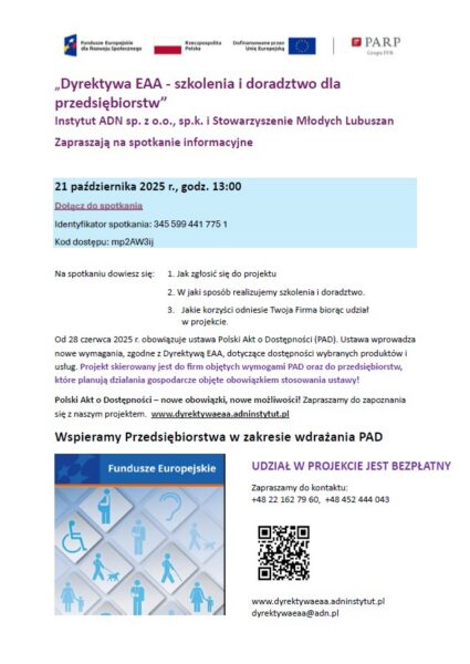 15 października 2025 Aktualności BEZPŁATNE szkolenia z zakresu wdrażania i stosowania regulacji prawnych zgodnych z ustawą PAD (Polski Akt o Dostępności)